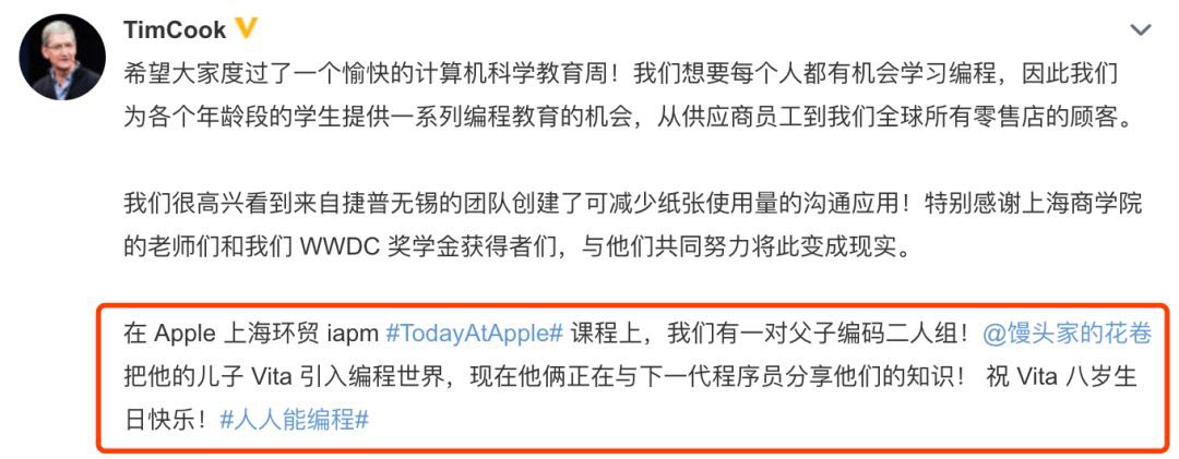 另外,12月16日,蘋果公司 CEO蒂姆·庫克還專門在微博上給他送上了生日祝福。