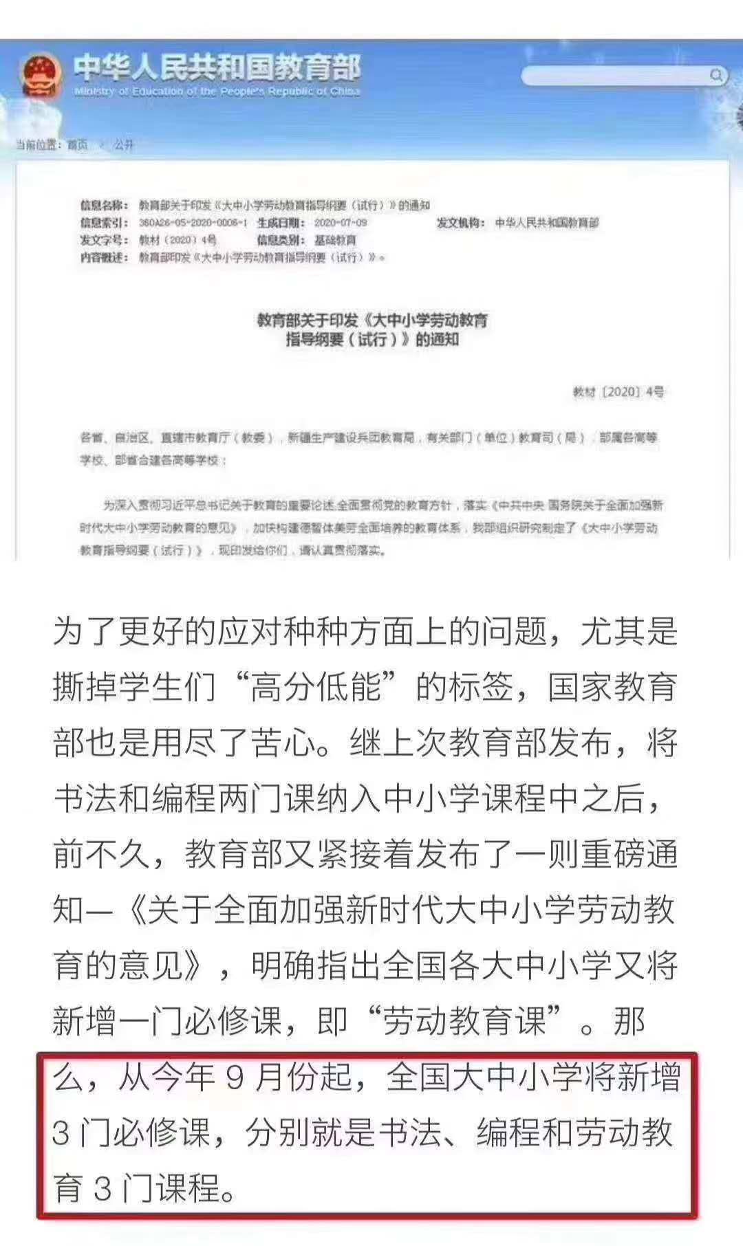 中小學中新增了3門課程,分別是勞動課、書法課和