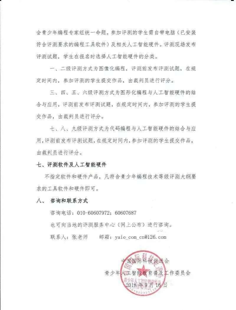 根據國務院《新一代人工智能發展規劃(國發〔2017〕35號)》(以下簡稱“規劃”),為搶抓人工智能發展的重大戰略機遇,構筑我國人工智能發展的先發優勢,加快建設創新型國家和世界科技強國,按照黨中央、國務院部署要求,面對新形勢、新需求,必須把握人工智能發展的重大歷史機遇。提高全社會特別是青少年對人工智能的整體認知和應用水平、實施青少年人工智能教育普及、設置人工智能相關課程、開展形式多樣的人工智能科普活動、加強人工智能后備人才的培養已成為當務之急。眾所周知,編程是人工智能的基礎技術,因為人工智能所涉及的各類技術(例如:圖像識別、指紋識別、機器人技術等等)都離不開編寫計算機軟件代碼,計算機軟件代碼的編寫就是編程技術。為推動編程技術在青少年中的普及,引導青少年學習、應用和發展編程技術,提高廣大青少年的創新能力,中國國際科技促進會青少年人工智能教育普及工作委員會將舉辦2018/19年青少年編程技術水平等級評測。