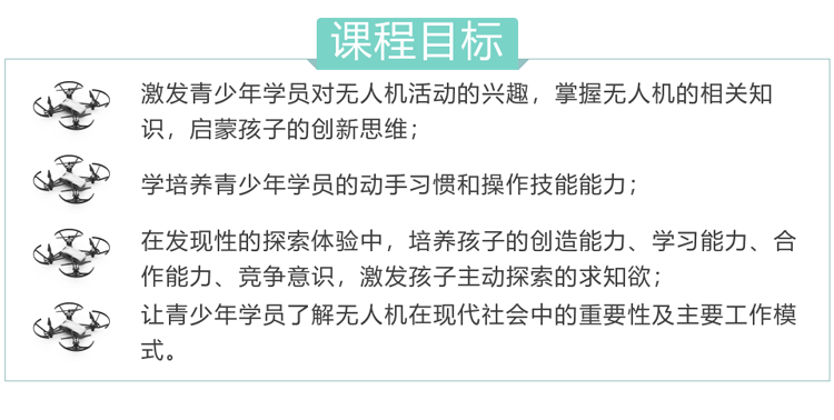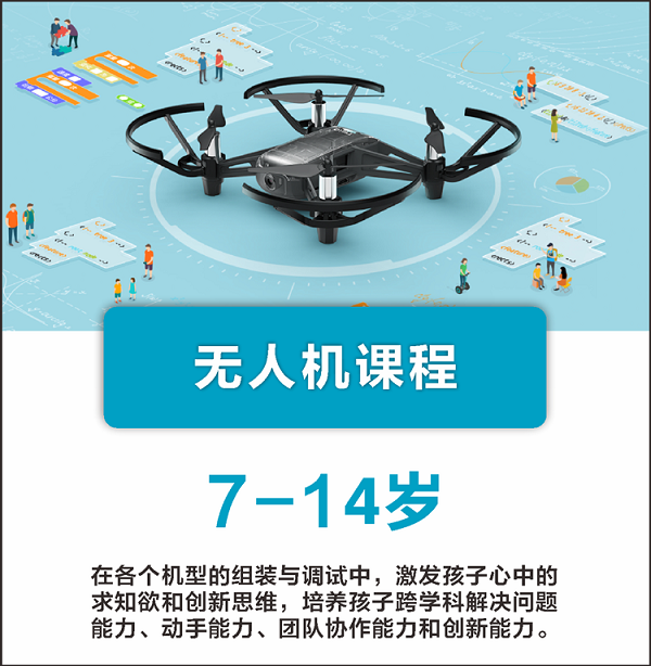 該課程讓學生初步了解無人機的飛控系統以及相關結構,利用圖形化編程實踐并掌握基本飛行操作,進一步做精準飛行控制、精準定位、航拍、編隊飛行、并學習利用簡單的 Python 進行人機交互控制。